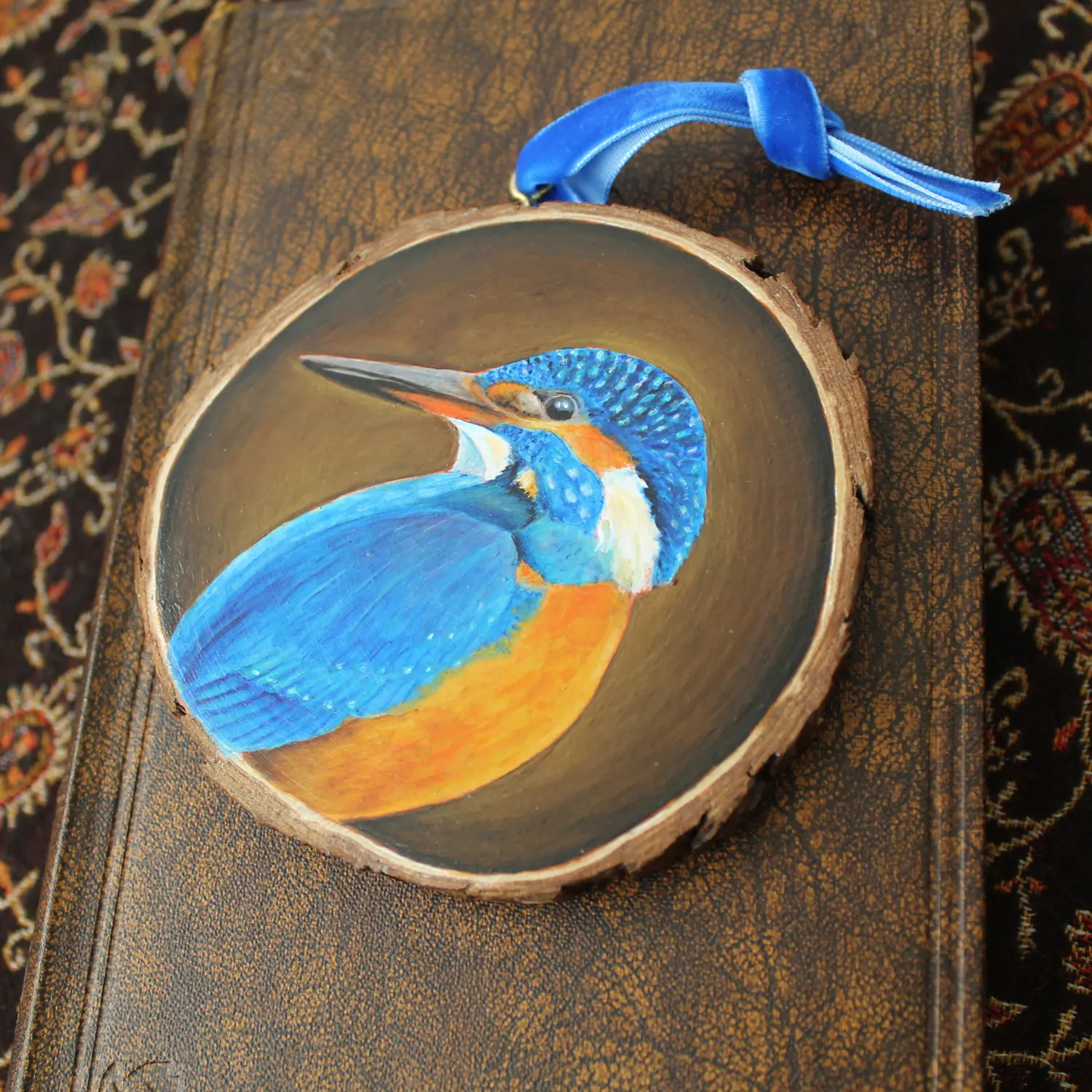 Original wood slice Kingfisher painting, varnished, signed and ready to hang.